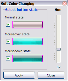 Create buttons in theme editor Create button... - to add new button to the current theme. After you click the "Create button" button, the "Create New Button" dialog will appear. Load image - to open button states image file (*.bmp) Horizontal and Vertical - to define edge width for each state. Edges are not scaled when you change the button size. Using edges is useful when you would like the button to have border. Then, if the border is within the edges, it won't be scaled. Central area is scaled in both directions. Corners are not scaled. Vertical edges are not scaled in vertical direction. That is, when you change the button height, vertical edges will not be scaled. And vice versa, horizontal edges are not scaled in horizontal direction. Let's change it's width to 150: As you can see, in the left image (Horiz. edge width = 1) whole button image was scaled to fit its new size. In the second case (Horiz. edge width = 10) left and right edges of the button were not scaled. Same with the vertical edge width. Save theme - to save theme changes. Move slider to find the color you like.