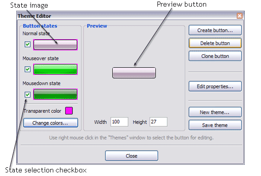 Transparent Color - to set the transparent color. When you add new button, transparent color is automatically set to match the color of the top-left corner of the button states image.